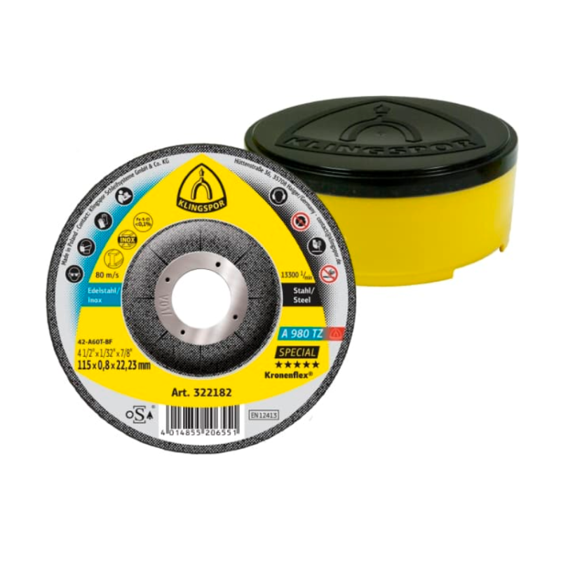 Klingspor ofrece el disco de corte Kronenflex A 980 TZ en la clase de rendimiento Special. Se trata de un producto de alto rendimiento que garantiza, en el ámbito de aplicación correspondiente, un rendimiento de corte óptimo y una excelente durabilidad. El disco de corte debe su alta agresividad al uso de materias primas de gran calidad. Las resinas y los materiales de relleno empleados están adaptados con precisión y garantizan unas características supremas con vistas a la estabilidad, el rendimiento de mecanizado y la resistencia al estallido. De esta manera, Klingspor ofrece productos de corte para todos los ámbitos. El grano abrasivo sintético, por su parte, es duro y tenaz, apenas se desgasta y muestra un comportamiento de lijado constante.